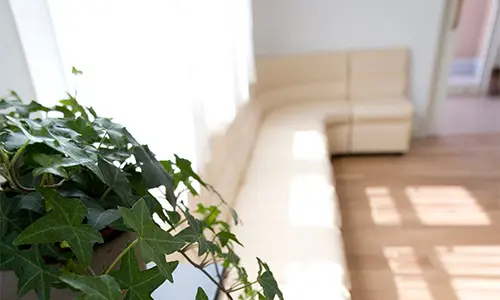 自然光が差し込む明るい待合エリア。木製のベンチと観葉植物が配置され、壁には写真が飾られています。温かみのある空間デザインが特徴です。