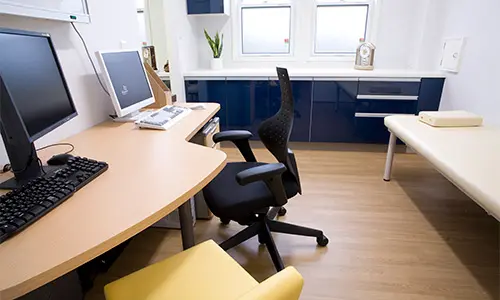 先生と患者様が向き合って座り、じっくりとお話ができる配置になっています。モニターを使った説明も可能で、患者様に分かりやすく丁寧な診察を提供できる環境が整っています。