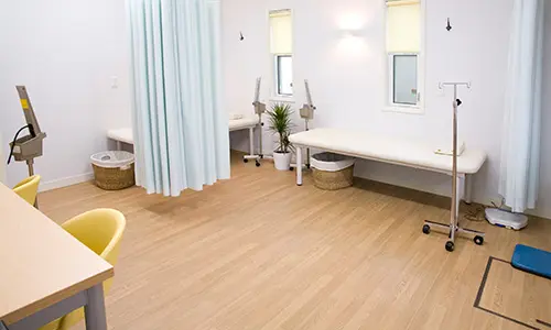 白を基調とした処置室。診察台とカーテンで仕切られたプライベート空間があり、清潔で落ち着いた雰囲気の中で処置を受けられます。
