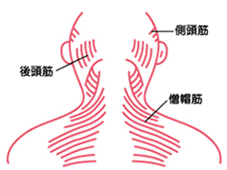 図のような筋が、長時間の同じ姿勢で緊張を強いられ、それに伴い血管が締め付けられ局所の循環が悪くなり起こる頭痛です。
